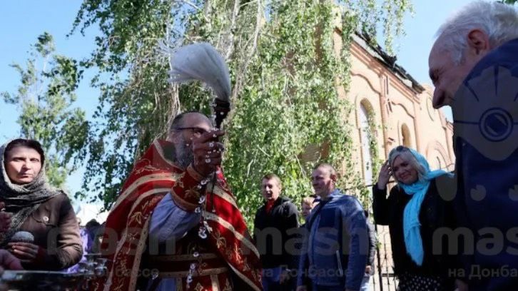 Пасха в освобождëнной Авдеевке — 30 человек пришли к разрушенному храму Архистратига Божия Михаила на освящение куличей. Подоспел и пёсель в надежде урвать пасочку.