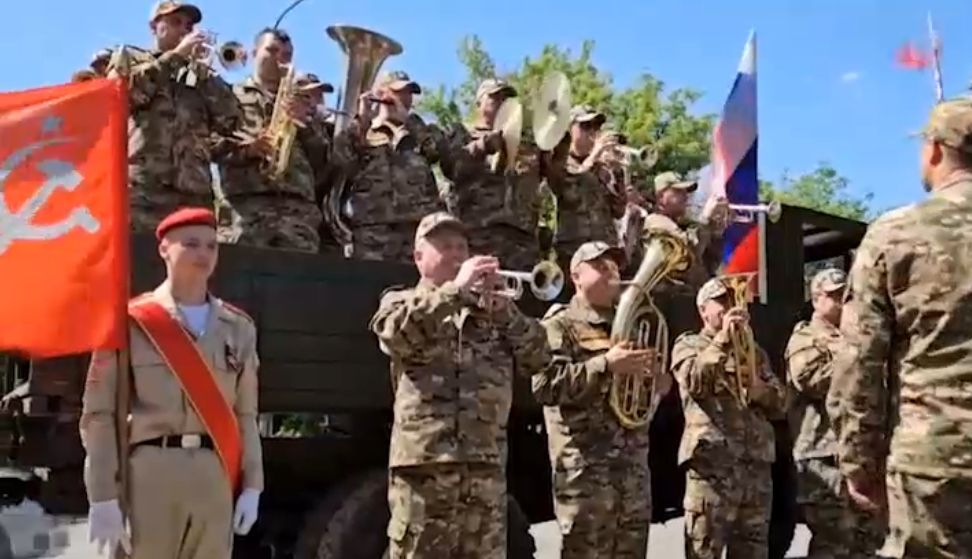 В Луганске военный оркестр второго АК поздравил ветеранов — музыканты приехали к ним на ретроавтомобиле, чтобы спеть фронтовые песни.
