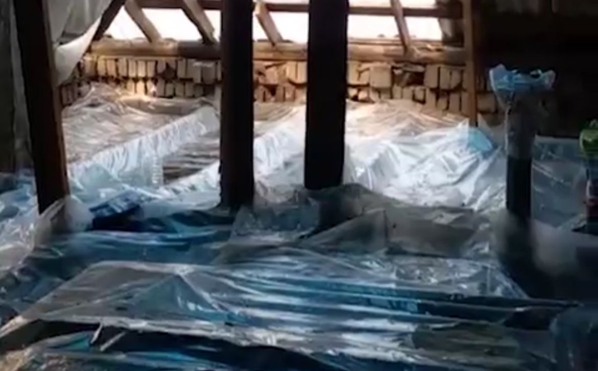 Одна из жительниц рассказала, что коммунальщики начали восстанавливать двухэтажку на Гагарина ещё весной. Сняли кровлю и... всё. Итог: проводку залило дождём, по стенам пошёл грибок. Хозяева не выдержали — скинулись и купили тент с досками, чтобы как-то спастись от сырости.