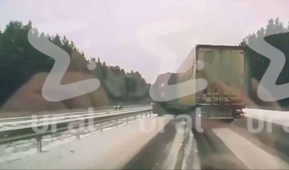 Фуру развернуло посреди трассы М-5 из-за гололёда. Машина встала поперек дороги, полностью перегородив движение. На Челябинском тракте собралась огромная пробка.