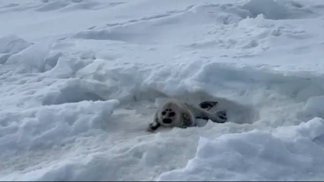 Мини-тюлень, видимо, грелся на солнышке и ждал маму. Увидев людей, шустро скользнул в прорубь и махнул ластами на прощание.