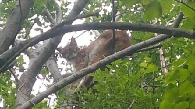 Сидящую на дереве рысь заметил мужчина возле своего дома в районе КБЖД — та гналась за добычей и испугалась собак. Не расстроилась. Попозировала среди листвы и, довольная, убежала в лес.