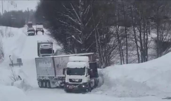После нашего поста дорогу расчистили, но взобраться туда — задача со звёздочкой. Очень скользко. Водители застряли рядом с ручьём Медвежий. Одну из засевших фур пришлось вытягивать двумя многотонниками.