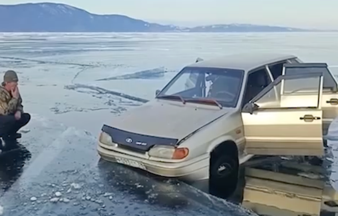 Очередная легковушка застряла во льду на Байкале. От полного погружения спас бампер — зацепился за корку.