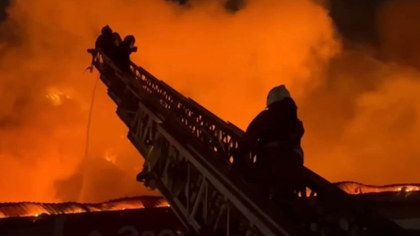 По нашим данным горит примерно половина здания. Пожарные продолжают бороться с огнём.