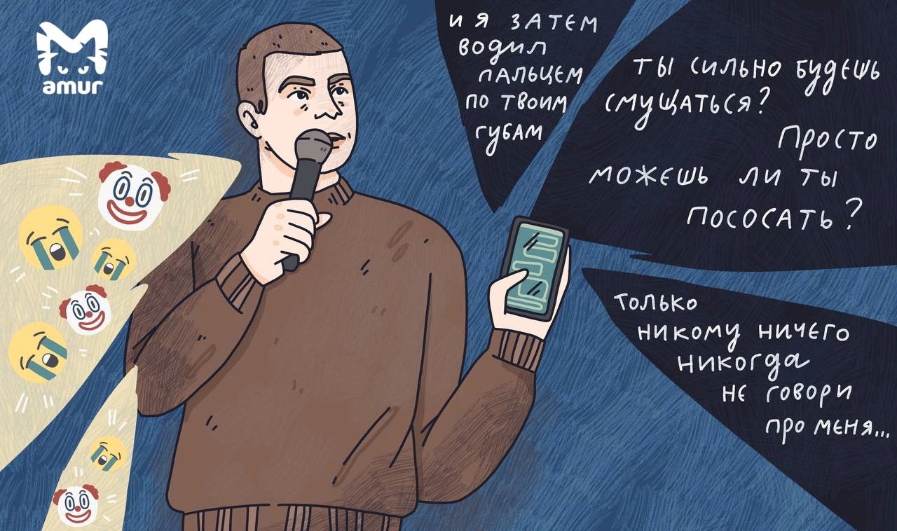 Я — Катя. С Сергеем Андрейчуком познакомилась в один из самых сложных периодов моей жизни (были очень плохие отношения с семьёй). Он затянул меня в "Стендап ВЛ". Чуть позже предложил принять участие в одном мероприятии — для этого нужно было отредактировать текст. Приехала к нему домой. Были расспросы о близких и бесконечные попытки меня потрогать или поцеловать. Я просила держать дистанцию, но мои слова восприняли как флирт и игру. Дальше, несмотря на страх и слёзы, случился секс. На столе стояла камера (до сих пор не знаю, была ли она включена). После ещё несколько раз ездила к нему по вопросам выступления, но всё заканчивалось одинаково — насилием.