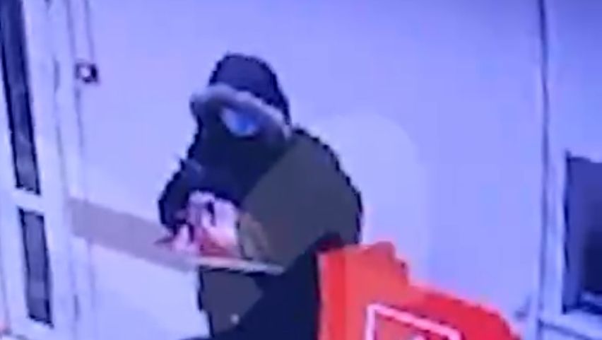 На записи видно, как налётчик в тёмном заходит в отделение на остановке Заводская. Достаёт из пакета пистолет, хватает двух сотрудниц за руки и приказывает отдать ему деньги.