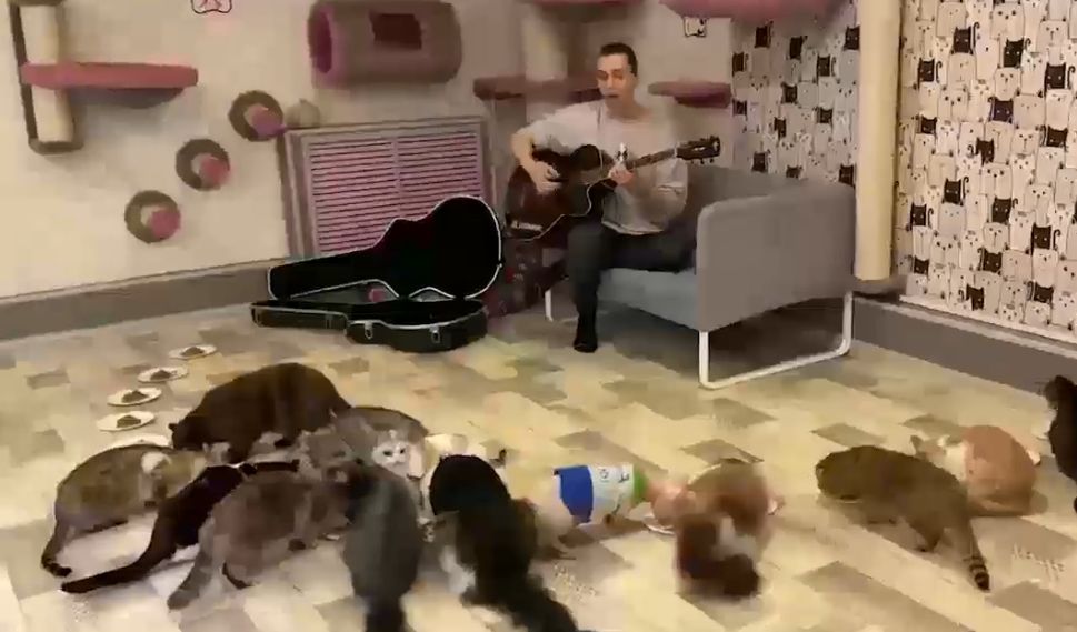 Хабаровский музыкант выступил для пушистых слушателей в котокафе. Так он поздравил их с праздником.