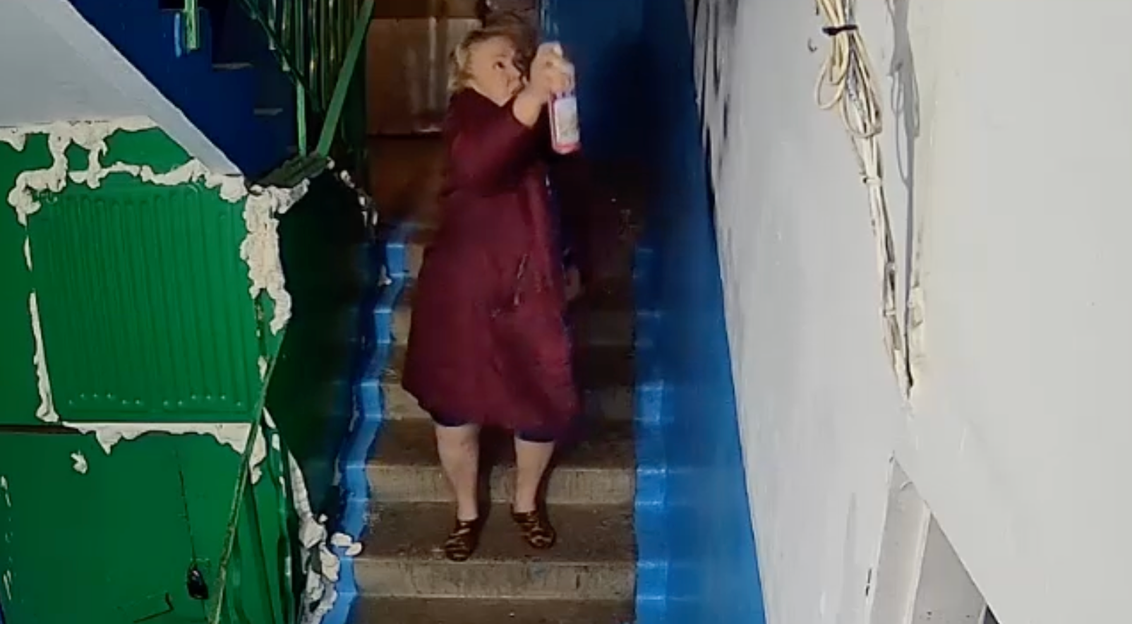 Прежде чем заняться творчеством, дама в шёлковом платье и малиновом плаще погасила свет на лестничной клетке. Но шалость не удалась — камера в доме на Сафонова её заметила. На свежеокрашенных стенах появились не слишком высокохудожественные загогулины.