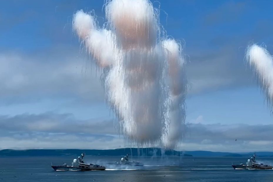Ожившую 3D-картинку сняли местные. Пара выстрелов и вжух — в воздухе над кораблями повисла сахарная вата.