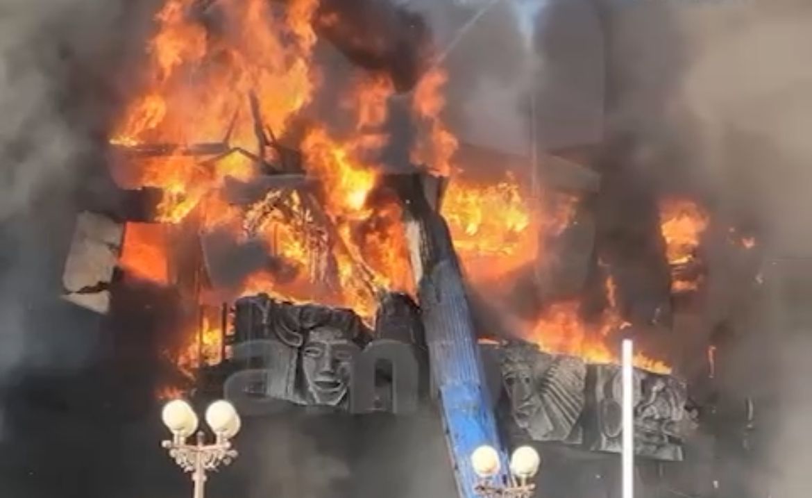 Момент обрушения крыши горящего театра музыкальной комедии в Хабаровске.