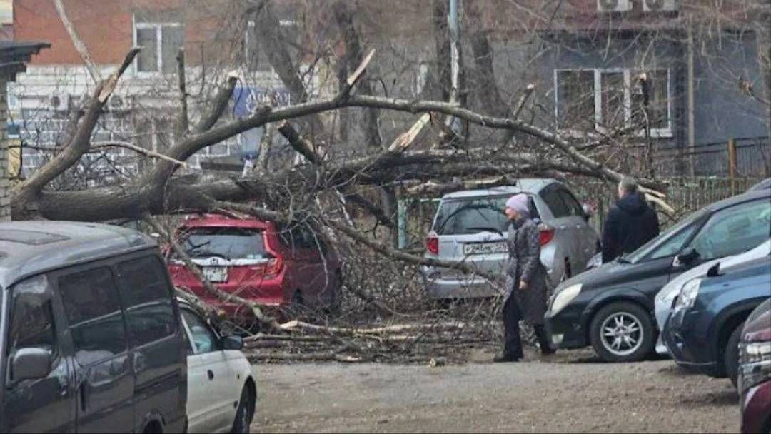 Вырванная обшивка дома и рухнувшее на машины дерево — штормовой ветер бушует во Владивостоке.