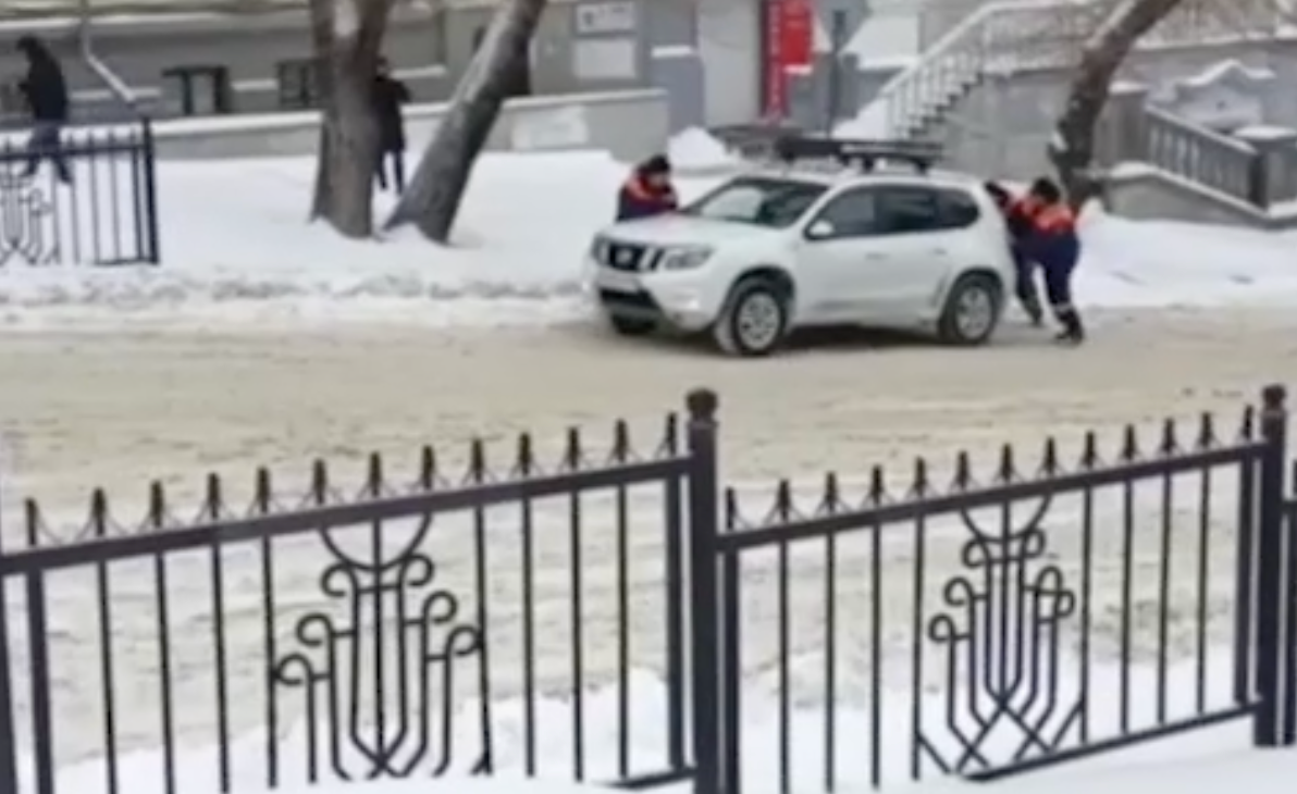 Главные улицы города — сплошные спуски и подъёмы. Обильный снегопад добавил кучу проблем: водители не могут вскарабкаться в горку. На выручку приходят сотрудники МЧС. У этих ребят утро выдалось по-настоящему бодрым — паркуют тачки вручную.