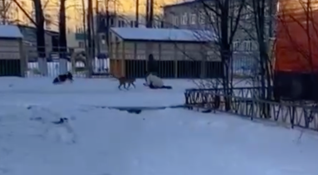 Псы налетели на гулявшую с питомцем женщину около детского сада "Дружные ребята" в Поронайске. Их хозяйка была рядом, но помогать не стала — пришлось использовать шокер.