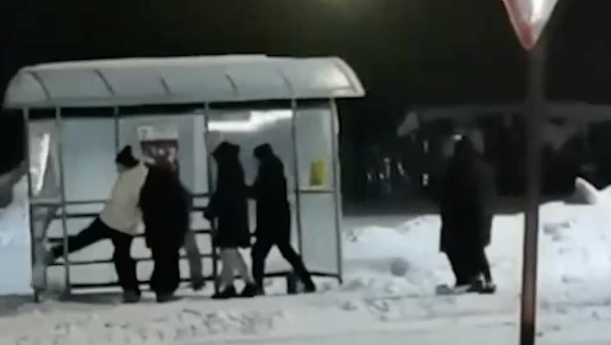 Школьники ждали маршрутку на "Посёлке Бумажников" в Поронайске. Заскучав, решили проверить павильон на прочность — колотили ногами и руками под укоризненные взгляды прохожих.