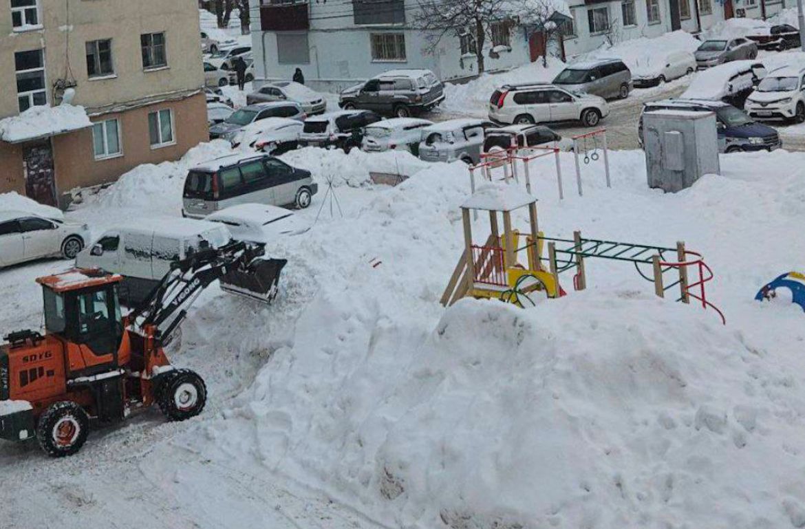 Снегом с дорог заваливают детские площадки в Южно-Сахалинске.