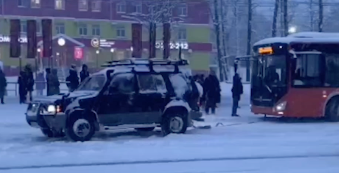 Застрявшие в сугробах на остановках автобусы приходится вытаскивать джипами в Хабаровске.
