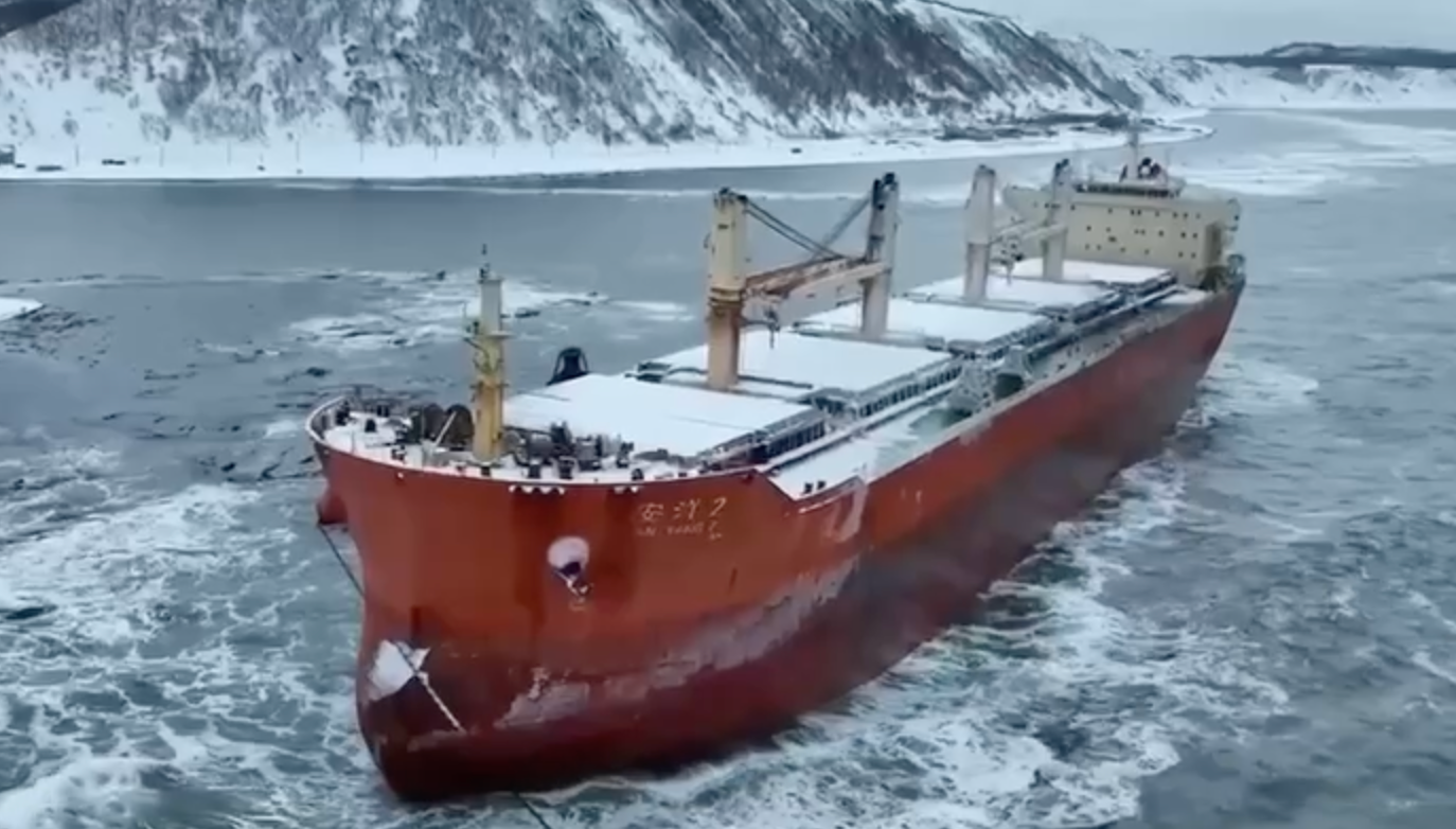 An Yang 2 стоит возле Невельска уже третьи сутки. Спецы сейчас в тяжёлых условиях — погода снова подкидывает проблем. Осмотреть сухогруз у них получилось лишь частично — пробоин пока не нашли. В воде нефтепродуктов тоже не видно.