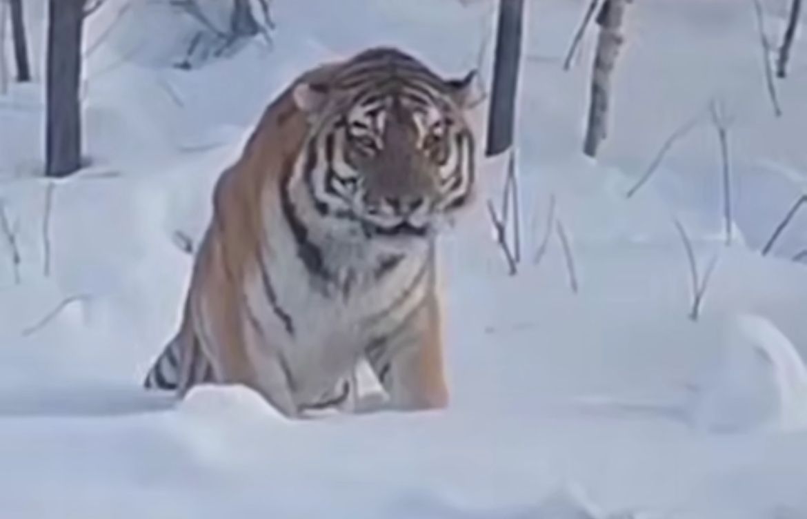 Беззубый тигр с окровавленной мордой ходит по трассе в Хабаровском крае.