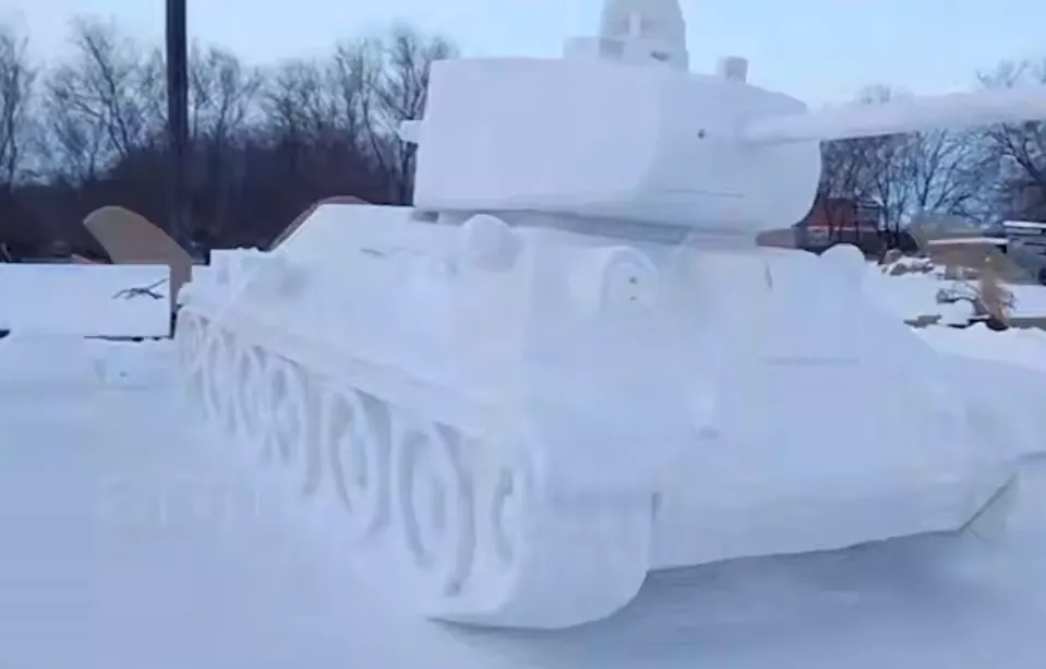 Т-34 из снега в натуральную величину построили дед с внуком в Амурской области.