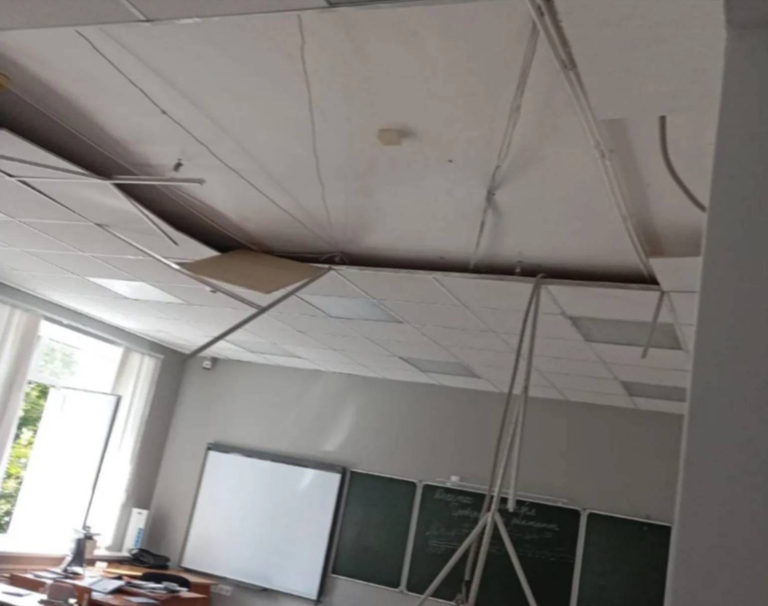 По словам учеников СОШ №9 посёлка Виноградного, на уроке русского языка обвалилось девять плит. Классный руководитель быстро вывел ребят, но они успели сфотографировать огромную дыру. После директор заставил детей всё поудалять — остался только один снимок.
