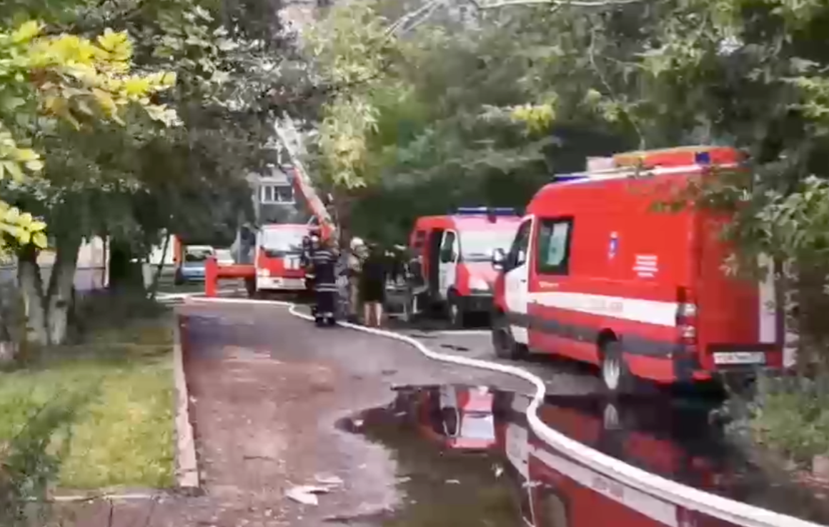 Опасность позади: пожарные разбирают и проливают крышу на Маяковского, люди ожидают во дворе с питомцами и вещами.