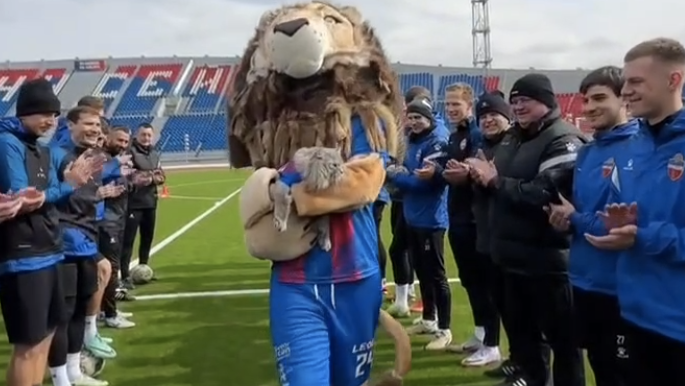 Лёва поставил свою подпись лапкой и получил именную футболку. Теперь он будет символом команды.