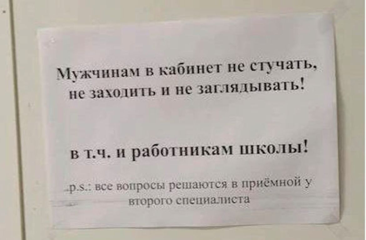 По словам родителей учеников, кадровичка вышла замуж, приняла ислам и запретила мужчинам даже стучаться или заглядывать за дверь. В управлении образования сказали, что всё не так. Мол, женщина перед Новым годом считала зарплату для учителей и объявление повесила, чтобы её не отвлекали.