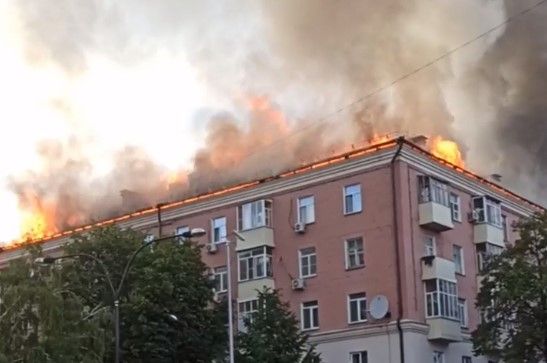 Загорелась 16-я квартира на пятом этаже. Огонь пошёл по кровле и захватил всю крышу.