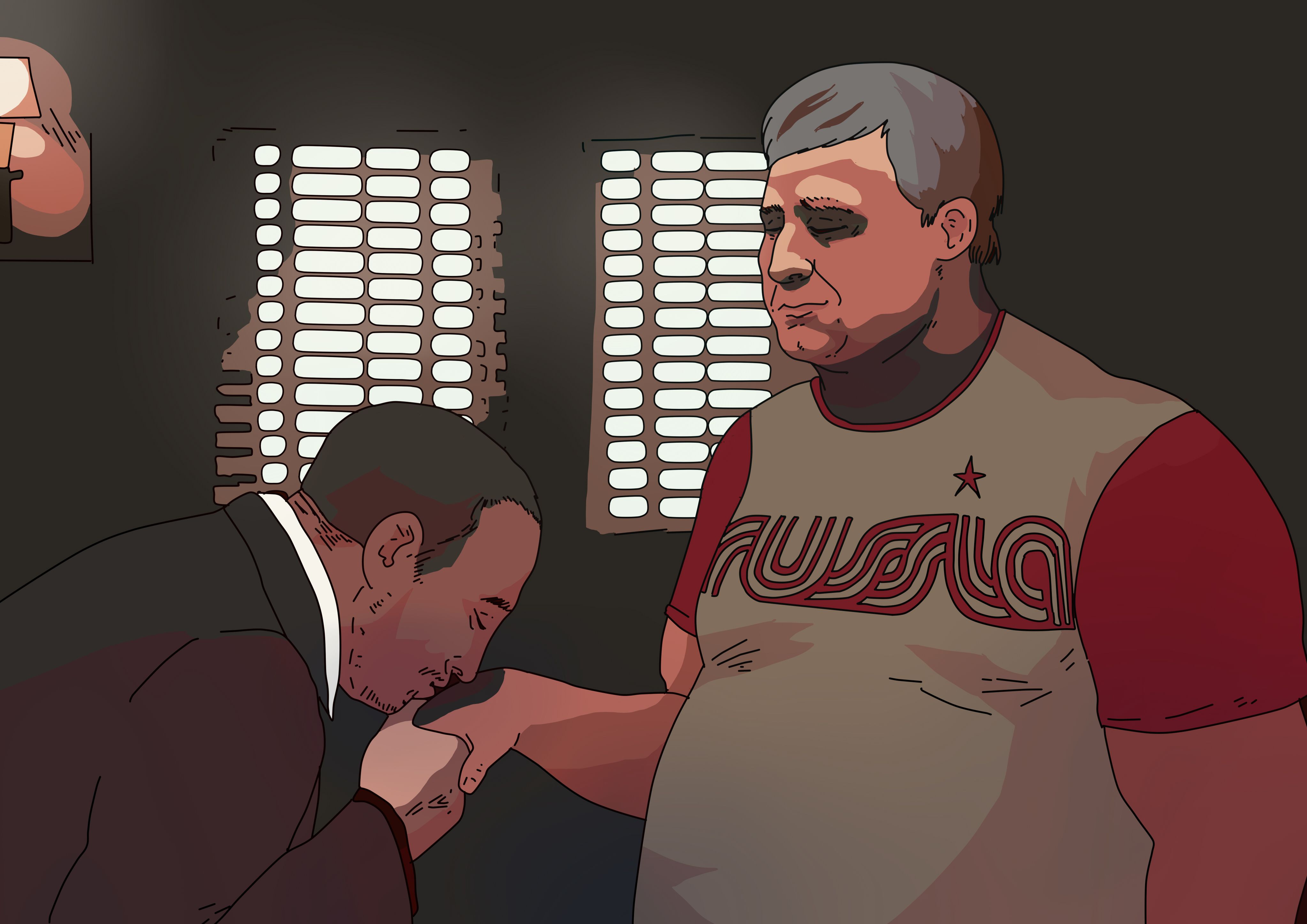 К мужчине подбегает один из охранников. Он объясняет, что пришедший — глава района и очень важный человек, что он проводит проверку, и с ним вообще так нельзя разговаривать. Но "важный человек" прерывает их — он просто подходит и ударом в лицо ломает Магомеду нос.
