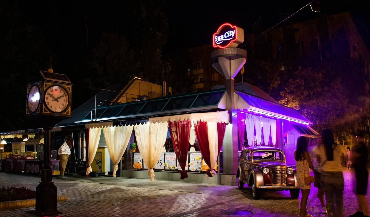 Sun city расположен буквально через дорогу, и там тоже иногда можно увидеть местных селебрити. Большой минус — подвала нет, зато есть светлая летняя веранда. Меню с уклоном в Европу — много разновидностей пиццы (можно даже собрать свою собственную), "английский завтрак", паста с итальянскими названиями на красивых тарелках с широкими краями. Когда тепло, здесь иногда обедают семьи с детьми или просто парочки.