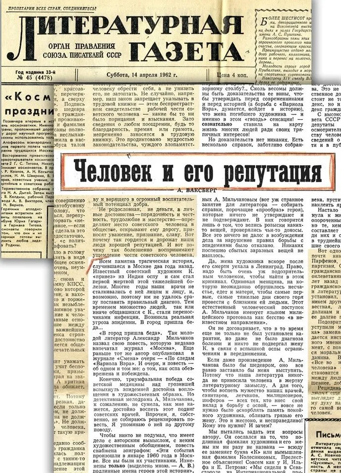 Все данные, связанные со вспышкой оспы в Москве, оставались строго засекречены. О ней нельзя было говорить открыто, но завуалированно — можно было попробовать. Что и сделал журналист Мильчаков, по крупицам собравший всё, что москвичи передавали из уст в уста: слухи, обрывки информации от врачей и милицейских. Не исключено, что он даже вполне искренне пытался разобраться в произошедшем. Иначе вряд ли отправился бы расспрашивать первую жену художника Кокорекина Валерию Васильевну и его дочь Валерию Алексеевну.