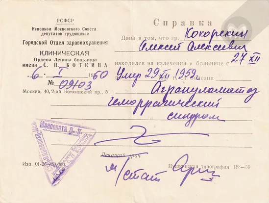 Лишь спустя 16 дней после смерти Алексея Кокорекина врачи поставили ему верный диагноз. Обычно такая оплошность со стороны медиков объясняется тем, что специалистов, которые воочию застали болезнь, практически не осталось.