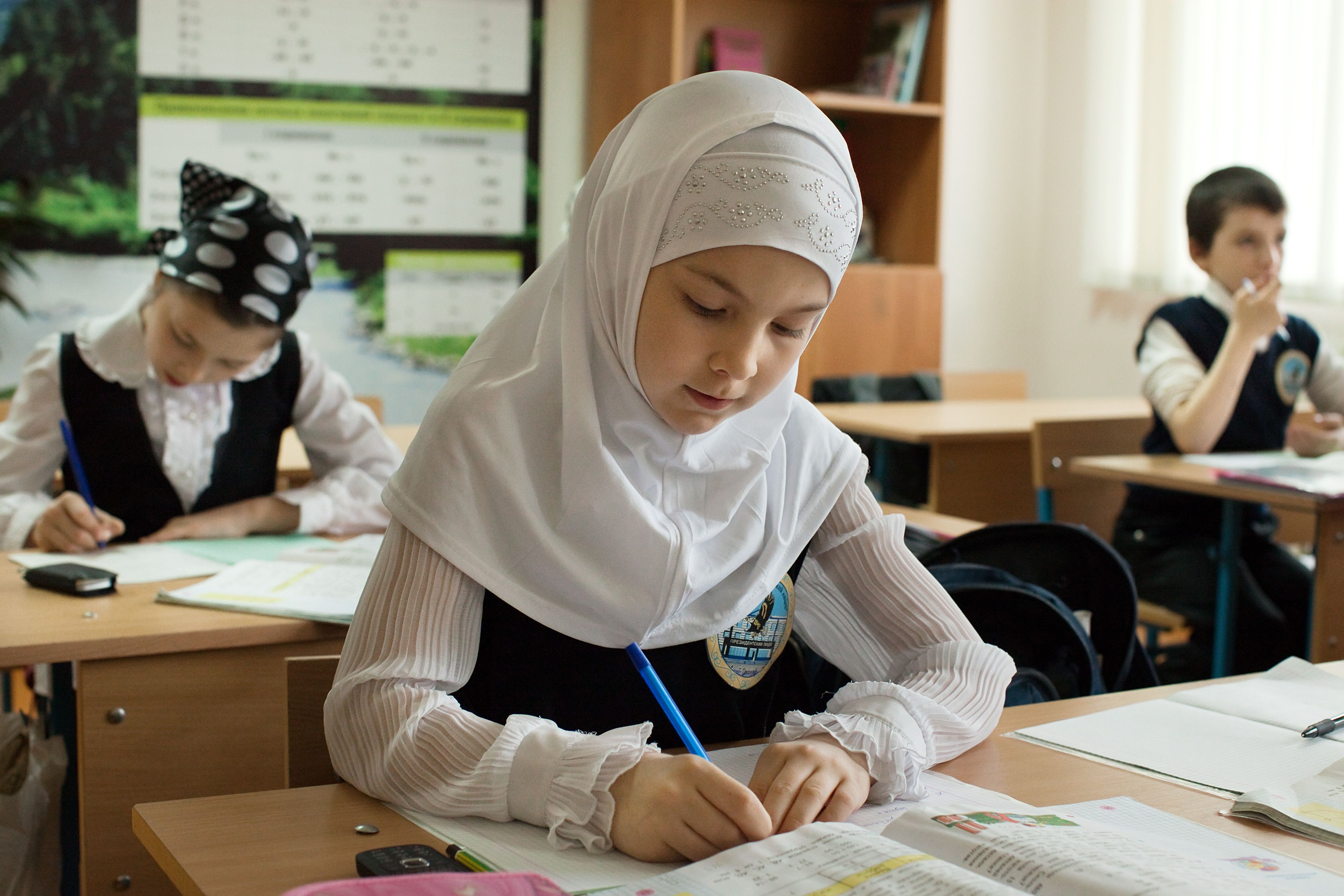 Раньше Айша не надевала головной убор на занятия. Но в этом году её верующие родители решили: дочь должна носить традиционную одежду. И в школе №88 она появилась, как и прежде, одетая в форму. Только голову украшал платок.