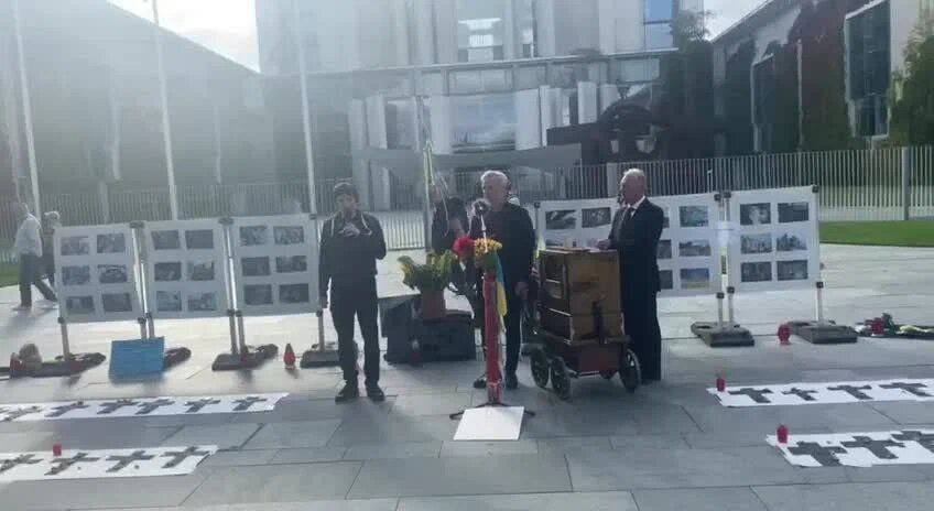 Украинские граждане разместили напротив резиденции канцлера инсталляцию. Заявили: посвящена она ушедшим в мир иной детям. Траурные речи и сумрачные лица прилагались. Но когда всё закончилось, формат прощания слегка изменился.