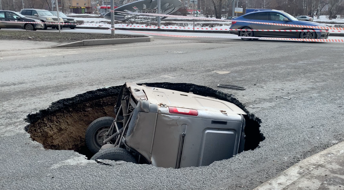 "Газель" полностью ушла под землю в Перми. Водитель успел выбраться из кабины, когда дал газ и почувствовал, что проваливаются колёса.
