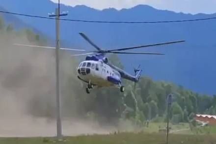 Эксклюзивные кадры момента падения пассажирского Ми-8 на Алтае. Видно, как вертолёт идет на посадку, его закручивает, он задевает столб и падает на бок.