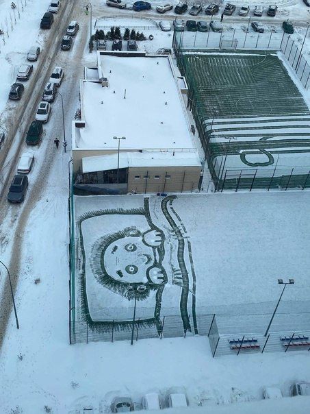Позднее Печёнкин запустил целую серию изображений на снегу: девушку, малыша под одеялом и много других художеств. Жители ЖК начали фотографировать такие картины, а местный футбольный клуб запросил у дворника рисунок их логотипа на поле — Максим отказался. Говорит, это кропотливая работа, а ещё надо снег убирать.