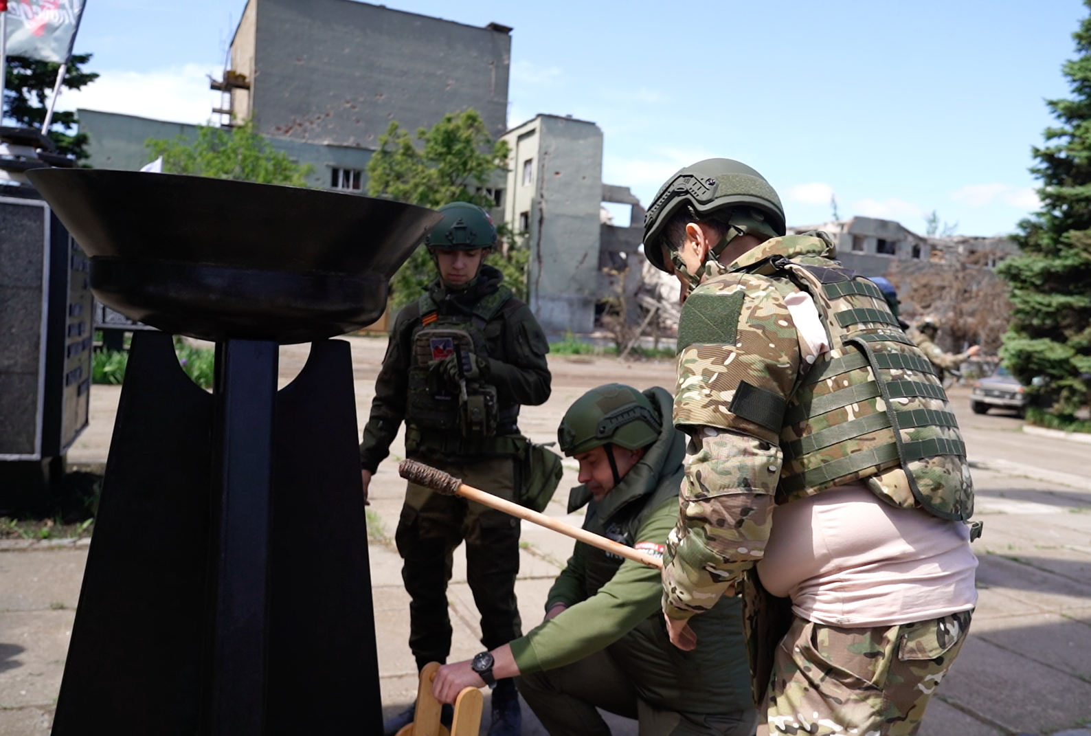 Духоподъёмные кадры из освобождённой Авдеевки. Вечный огонь зажгли у памятника "Подвигу летчиков-земляков". Пламя привезли из Москвы — от могилы неизвестному солдату в Александровском саду.
