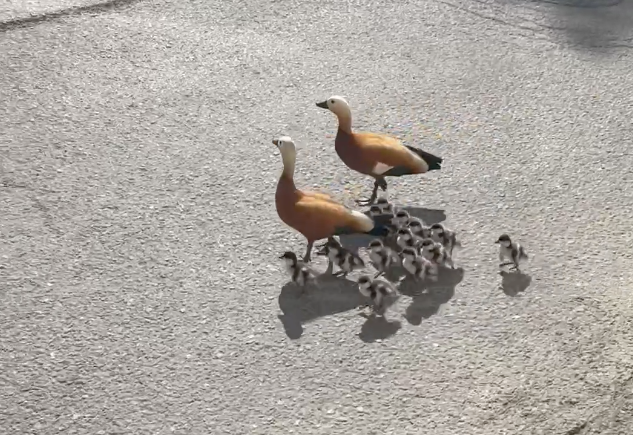 Милота из Старомонетного переулка в Москве. Мама и папа красные утки ведут через дорогу потомство к Третьяковской галерее. Чтобы окультуриться, а потом плавать возле моста влюблённых.