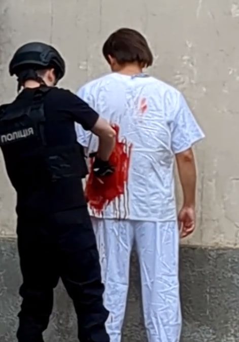 4:19: сотрудник киевской полиции обливает одежду мужчины кровью из пакета.