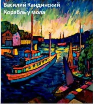 "Кандинский Василий Васильевич, Корабль у мола. Холст, масло 80х71, инв. № 794. Картина изображает корабль, видимый сверху, подходящий к молу. Около мола несколько парусных лодок. Преобладающие цвета: зелёный, синий, жёлтый и розовый. Без подписи".
