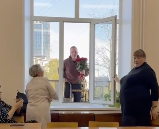 Врываемся в День учителя так же эффектно, как этот хабаровский школьник на автовышке! Перформанс с люлькой, цветы, поздравления и обещания хорошо доучиться — застелил, как сумел. А мы и присоединяемся!