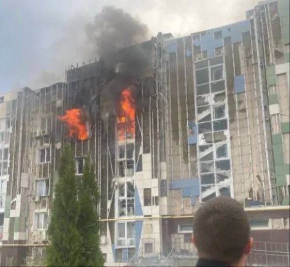 Прямо сейчас полыхают три квартиры. Спасатели эвакуируют остальных жителей многоэтажки. Рядом с ней находятся школа и детсад, никаких военных объектов поблизости нет.