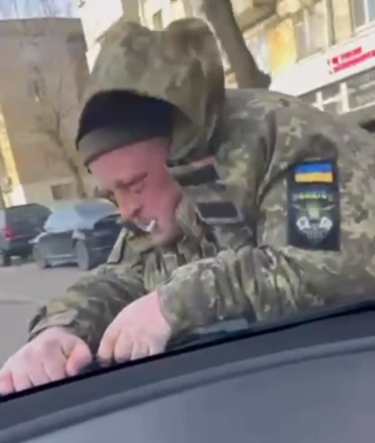 Водитель так не хотел на фронт, что не пожалел свою "Теслу". Военный, кстати, держался гордо, даже окурок изо рта не выпустил.