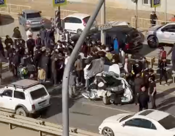 БТР раздавил "Ладу Приору" у пешеходного перехода в Махачкале. Водитель легковушки погиб.