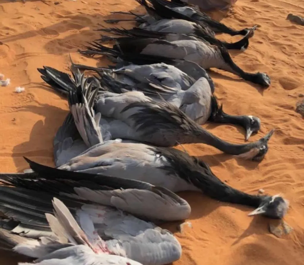 Оказалось, саудиты заманивают журавлей с помощью записи с голосами птиц + синего полотна, которое расстилают на земле (красавки думают, что это вода). Как только пернатые приземляются, саудиты отстреливают их, а потом снимают на видео — чтобы похвалиться трофеями в соцсетях.