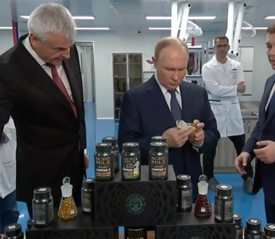 Для справки: президент приехал на предприятие "Омега-Си" — первый в России завод, который выпускает рыбий жир из сардины и сельди в особой форме — реэтерифицированных триглицеридов.