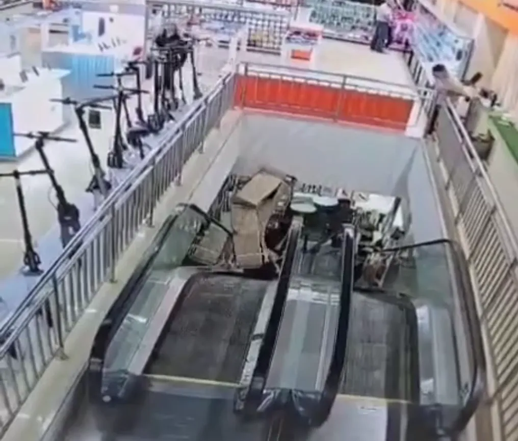 Акт II. Сотрудник магазина спускал телевизор с помощью эскалатора и не заметил, что коробка упёрлась в потолок. Из-за чего плазму согнуло, как раскладушку.