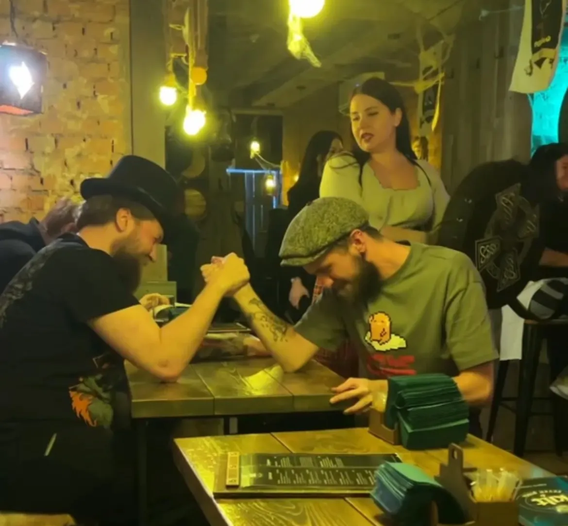 Всё случилось в пивнушке — в меню есть интерактивный коктейль, за который предлагают побороться на руках. Парни согласились, но в биф вмешалась официантка и помогла бородатому, который понравился ей больше.